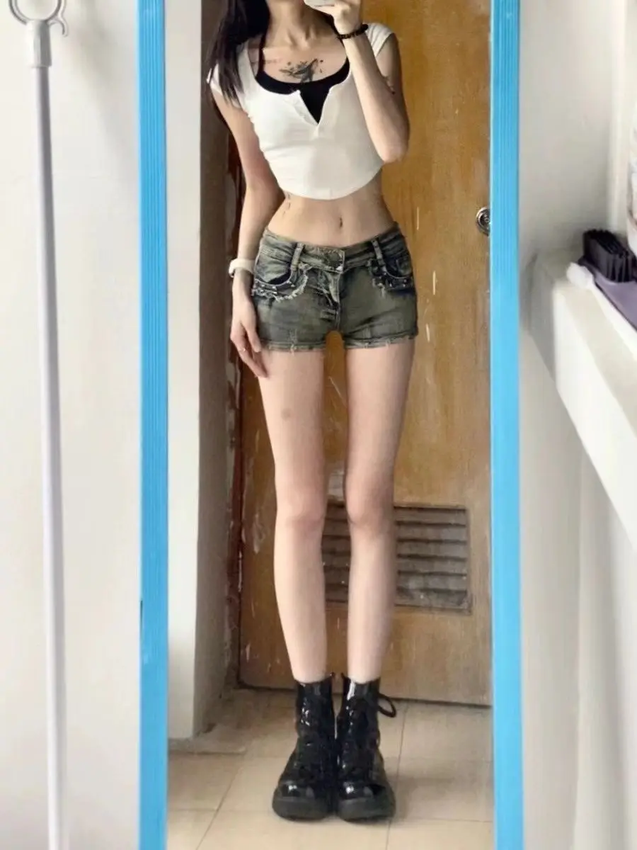 New Woman Designer Low Waist Punk Jeans Girls Aesthetic Elastic High Street Mini Pants Female Sexy Nightclub Summer Denim Shorts
