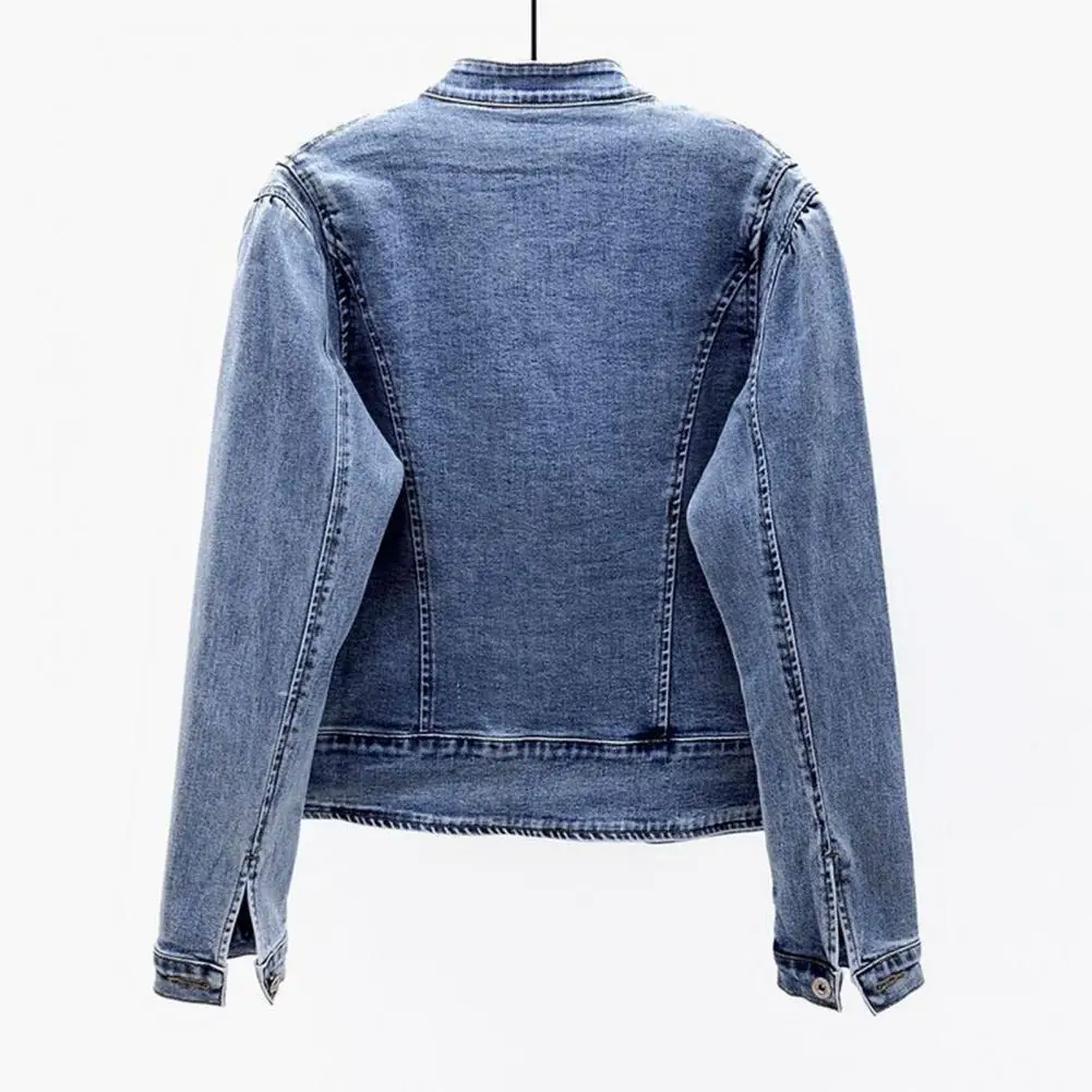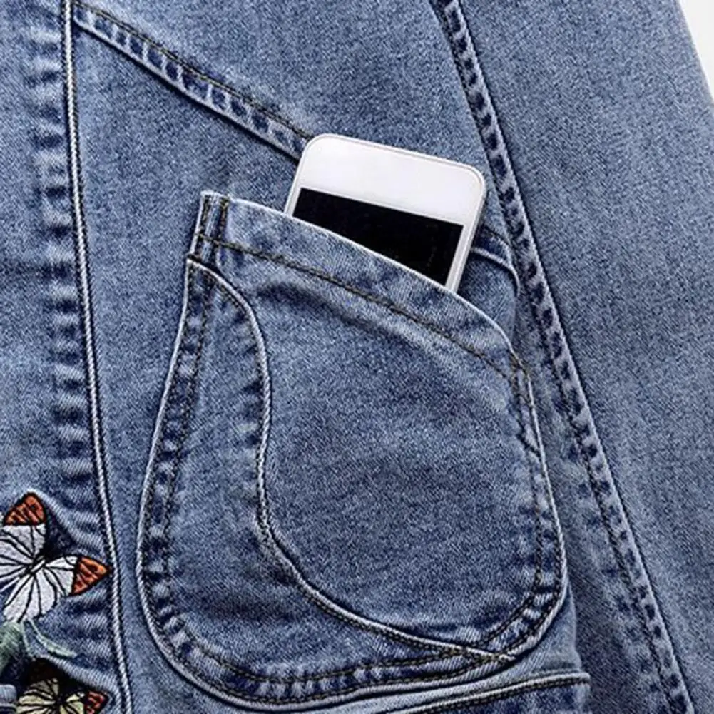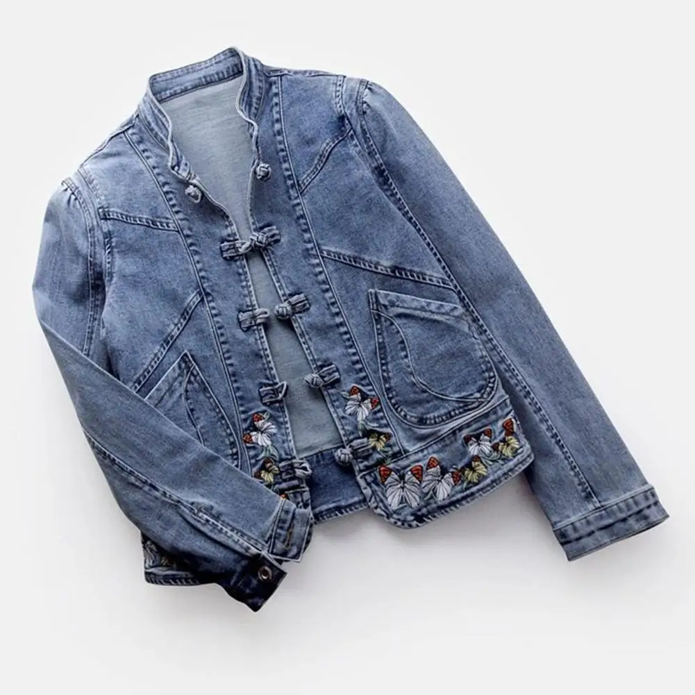 Women Jacket Butterfly Embroidery Single-breasted Long Sleeve Solid Color Turn-down Collar Slim Fit Chinese Style Lady Denim Coat