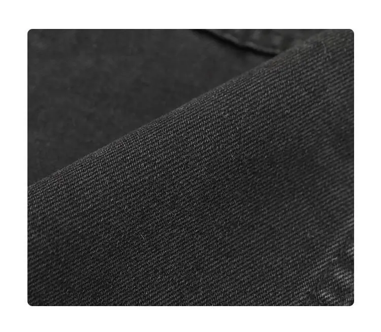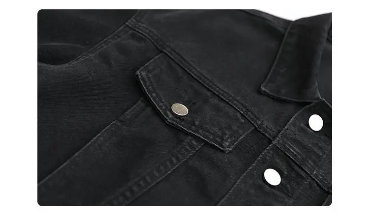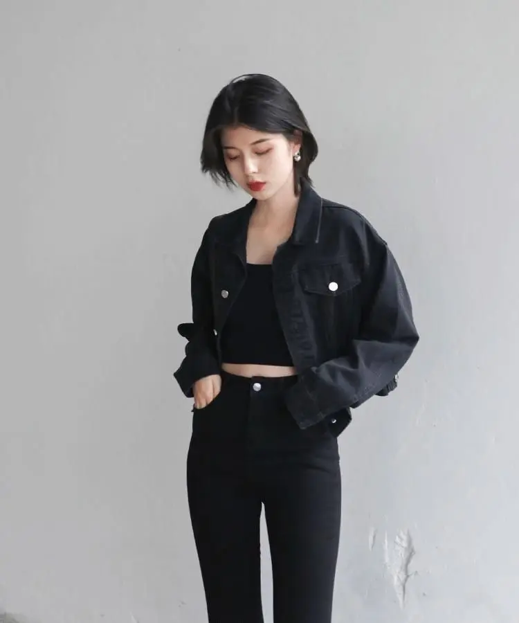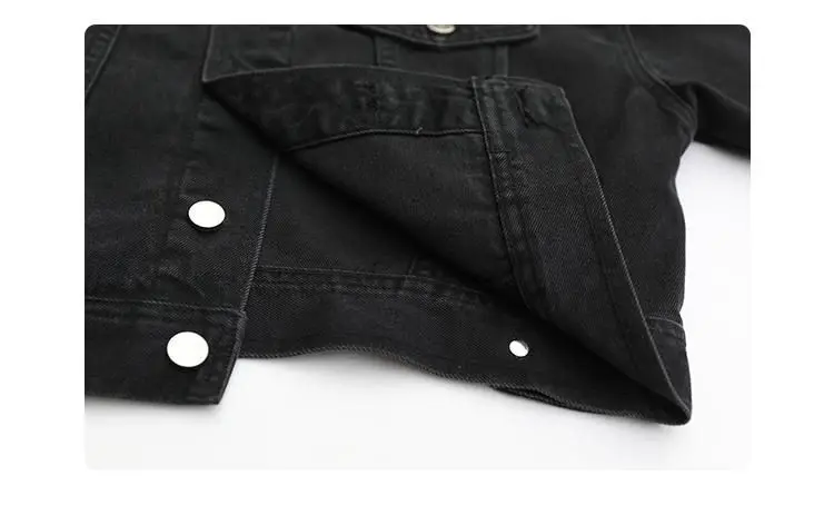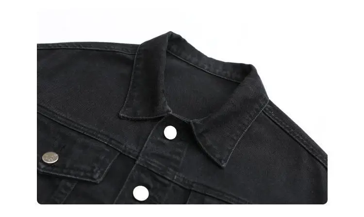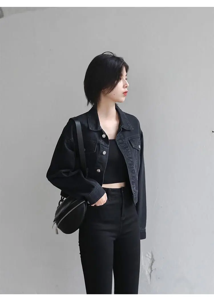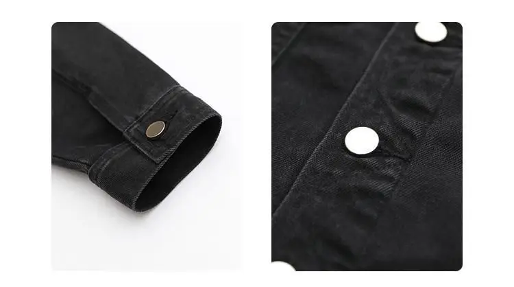 This jacket is a versatile outerwear piece, perfect for both spring and autumn seasons. Its classic black denim design makes it a versatile addition to any wardrobe.