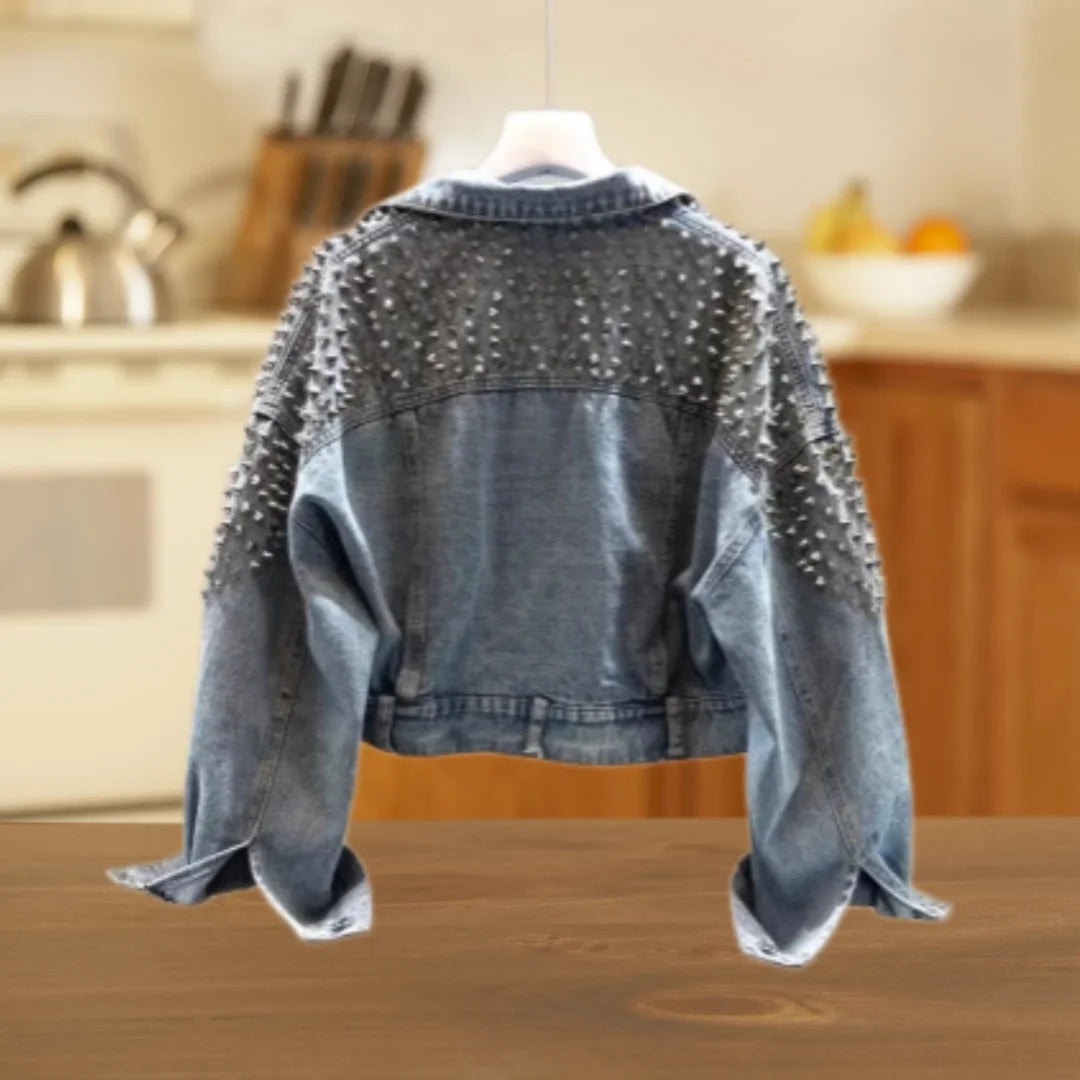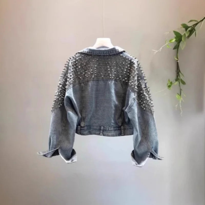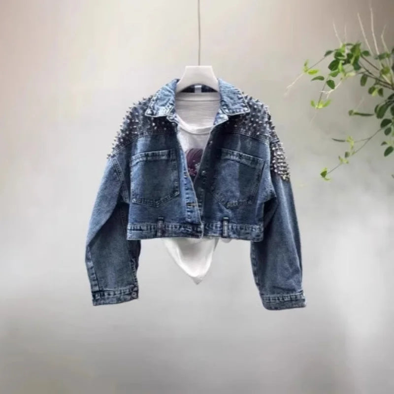 2026 New Korean Style Batwing Sleeve Heavy Studded Cropped Denim Jacket for Women, Washed Vintage Casual Streetwear Coat for