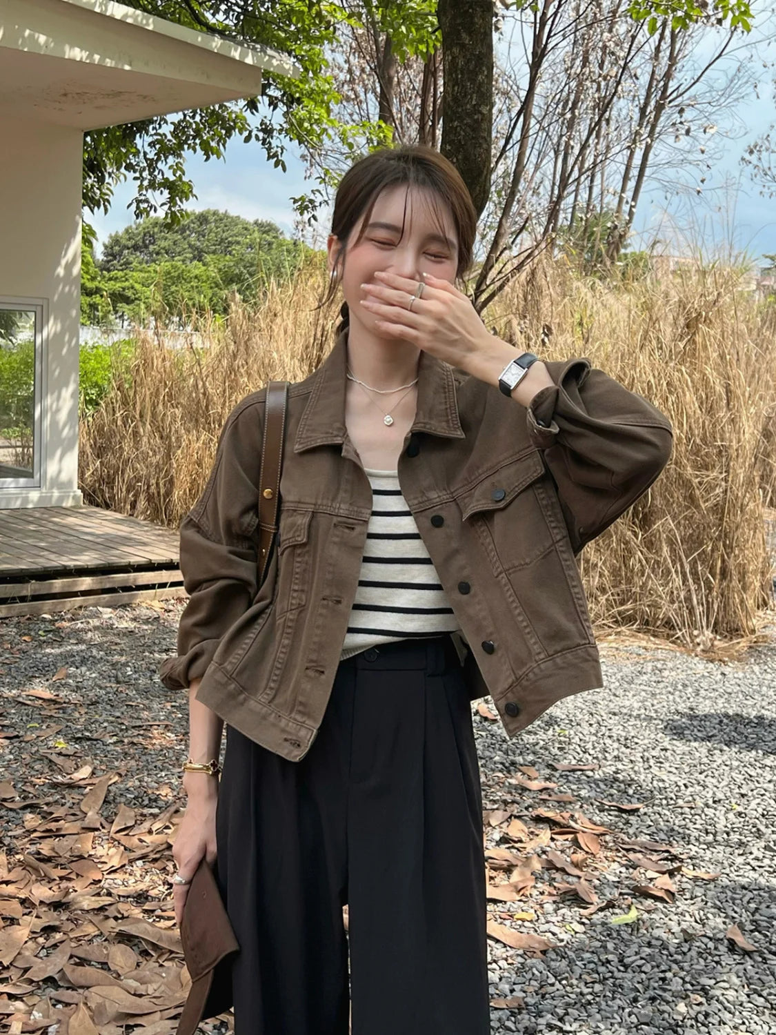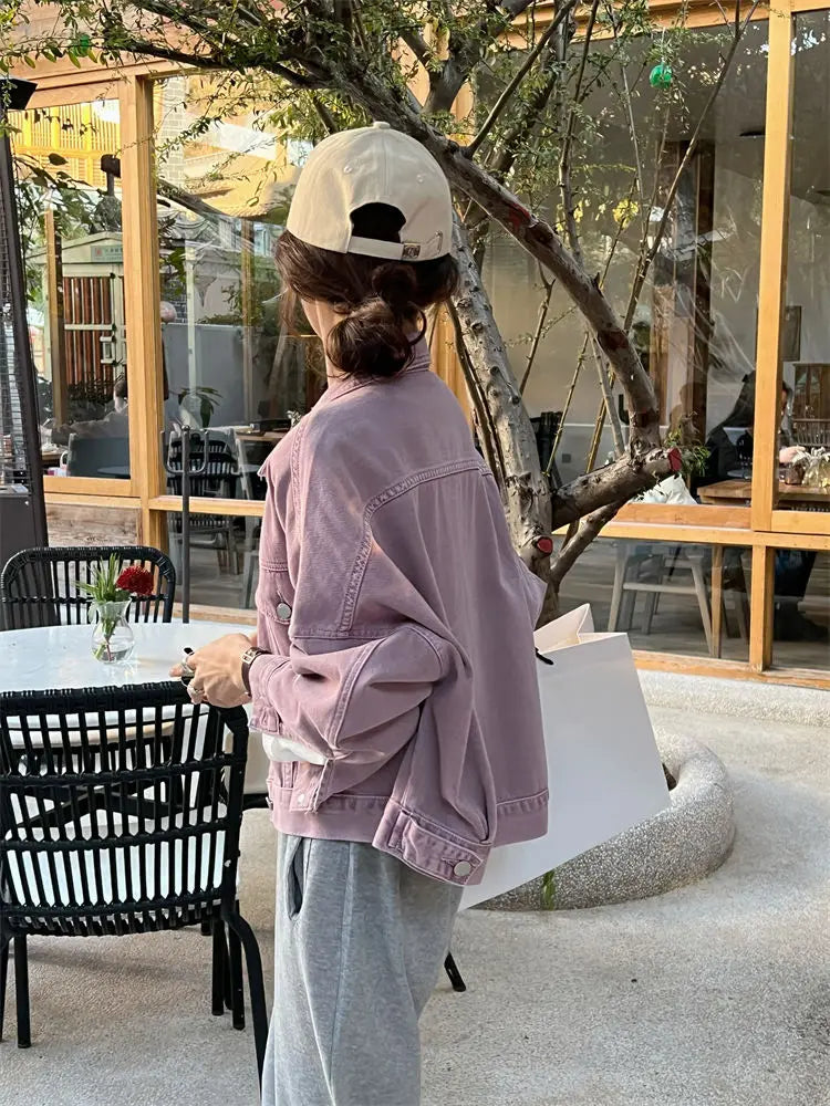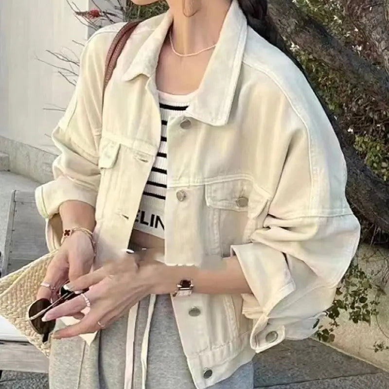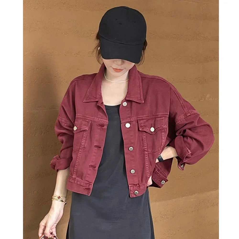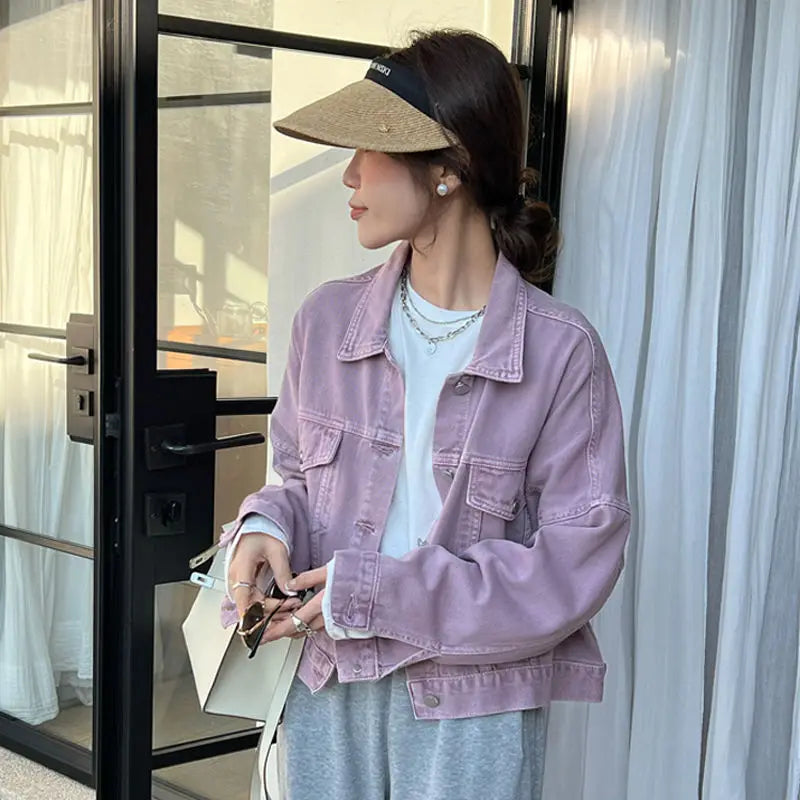 Brown Denim Jacket for Women Short Fit Korean Style Versatile Casual Jacket Spring Autumn Jacket