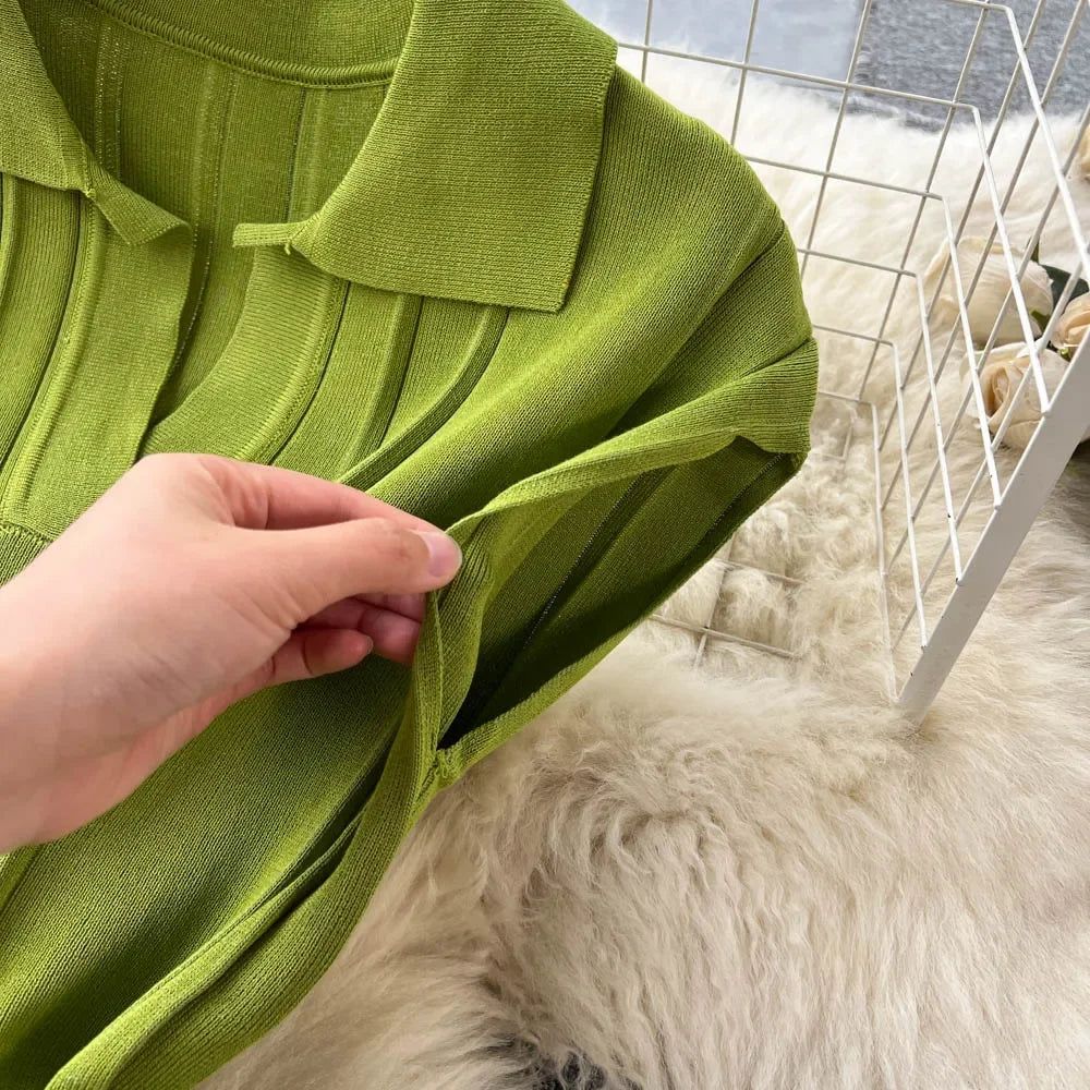 Korean Fashion Solid Pleated Knitted Dress Women Loose Turn-down Collar Short Sleeve Long Dresses Vestidos Elegantes Para Mujer