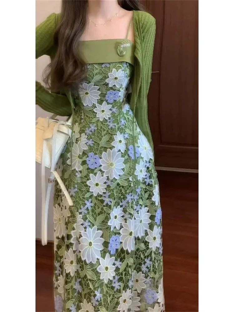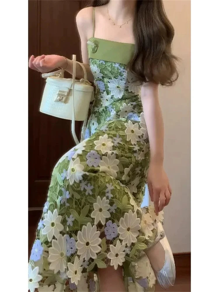 Mint Jasmine French Romantic Lace Hollow Green Strap Dress