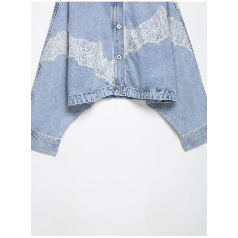 Women's Cropped Lace Denim Jacket New 2026 Spring Long Sleeve Button Female Chic Outerwears High Street Lady Chic Tops