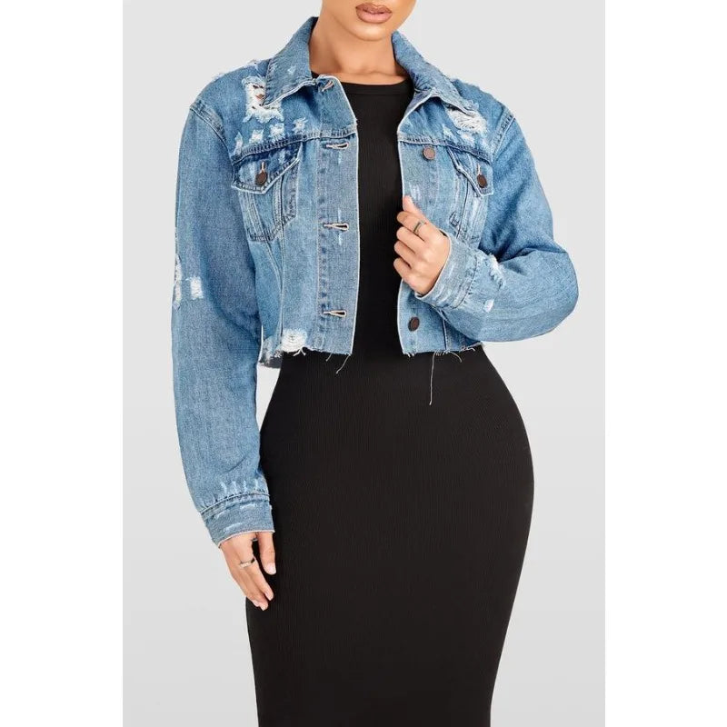 Women's Short Denim Jacket Distressed Frayed Hem Long Sleeve Collared Streetwear Fashion