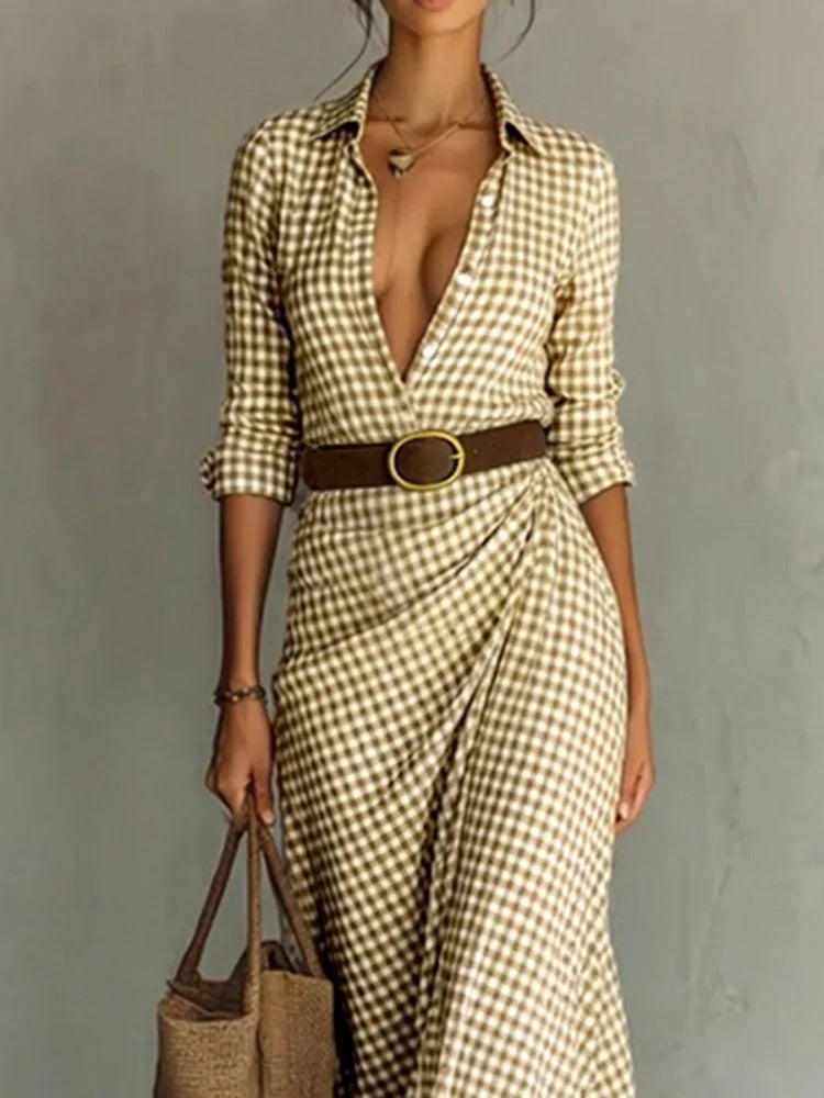 Yeezzi Women's Elegant Gingham Belted Lapel Shirt Dress Long Sleeves Buttoned Urban Casual Office Work Maxi Dresses 2026 New
