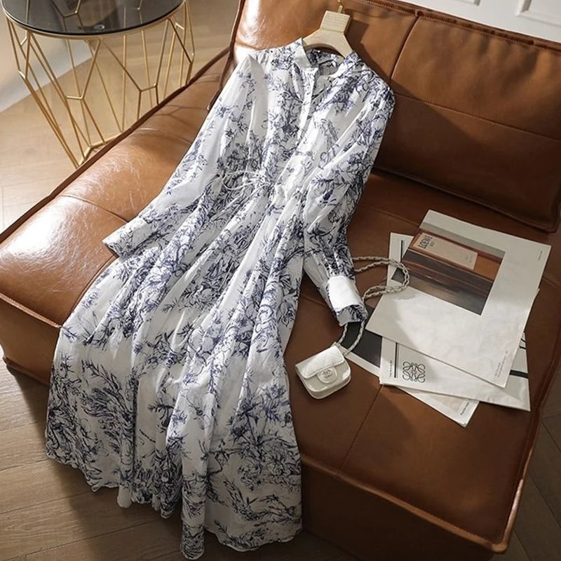 2026 Spring Chinese Style Ink Painting Printing Midi Dress Women Long Sleeve French Elegant Dresses Korean Fashion Y2k Clothing