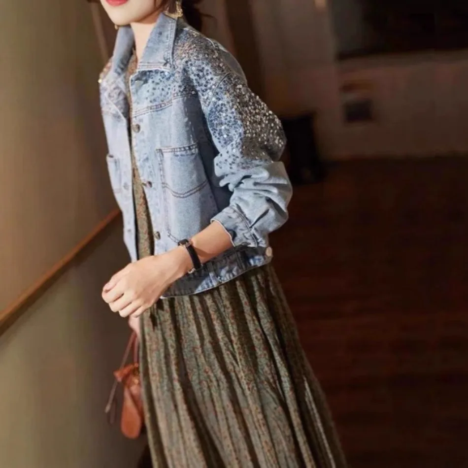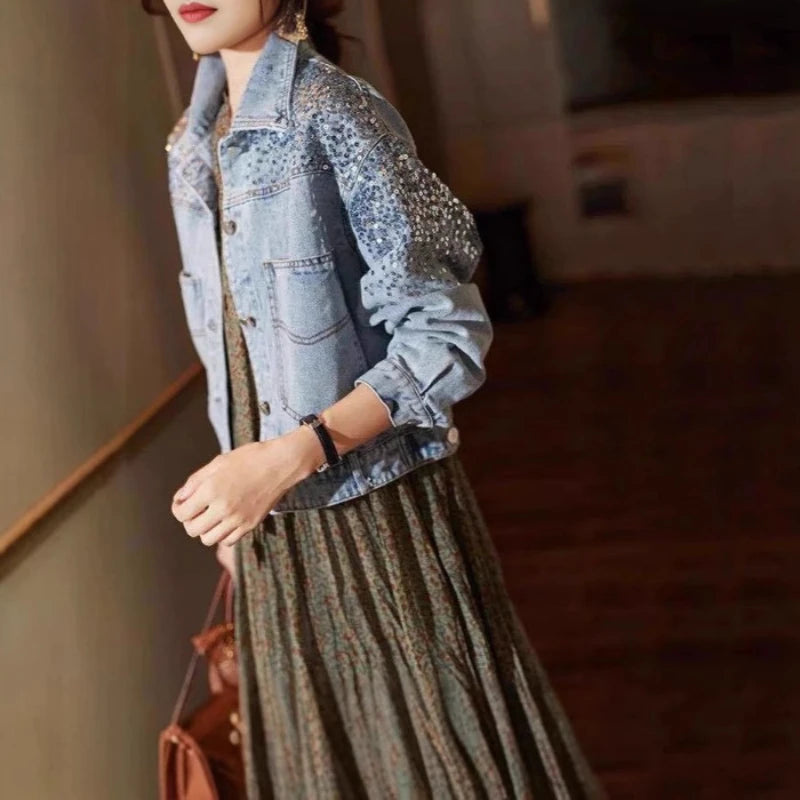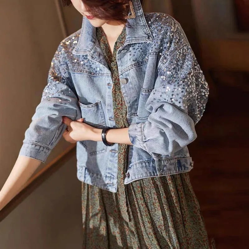 Fashion Sequin Denim Jacket for Women New Short Loose Slim Denim Coat Tops Sping Spring Summer Women's New in Denim Jacket