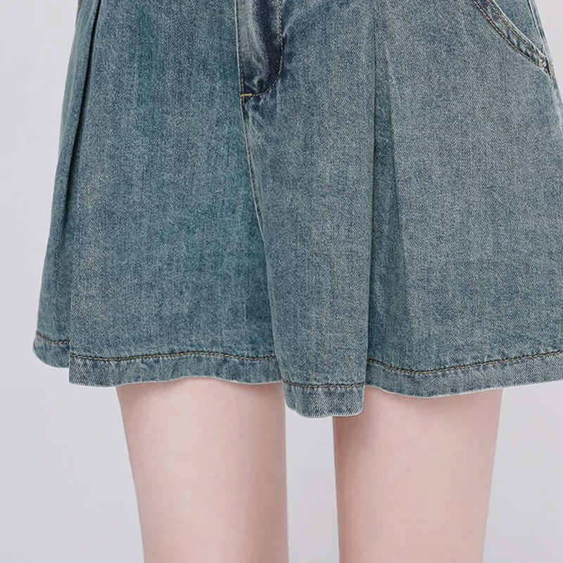 Korean Casual High Waisted Pleated Denim Shorts For Women Spring Summer Baggy Jeans Shorts Y2k A-Line Wide Leg Jeans