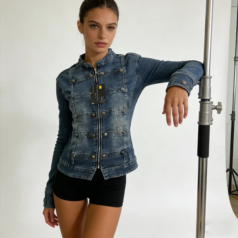 Retro Military Style Handsome Stand Collar Denim Jackets Female Double-breasted Wild Slim Short Denim Jackets Women Outerwear