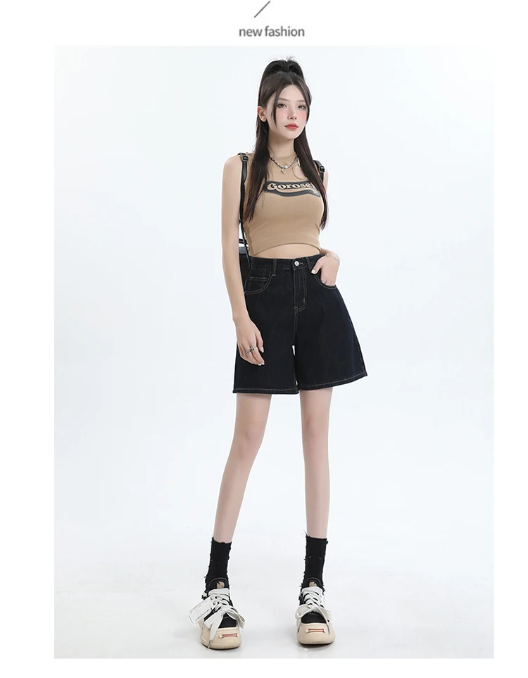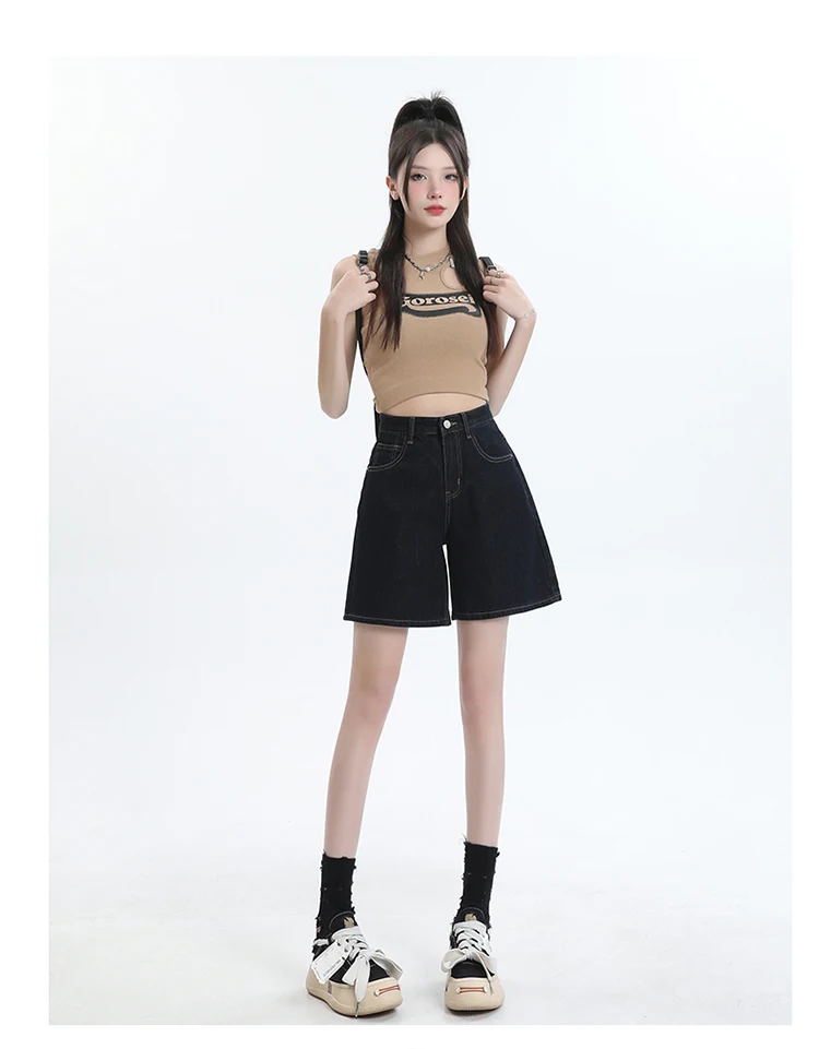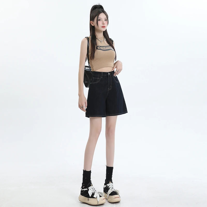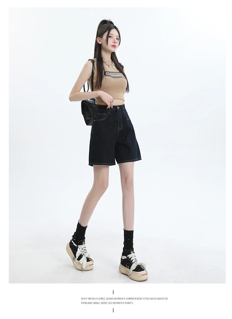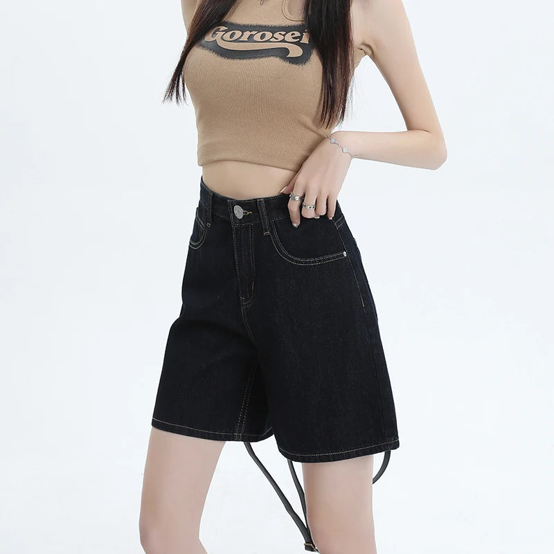 Women's Dark Blue High Waist Denim Shorts Loose Wide Leg Design Sense Niche Vintage Style