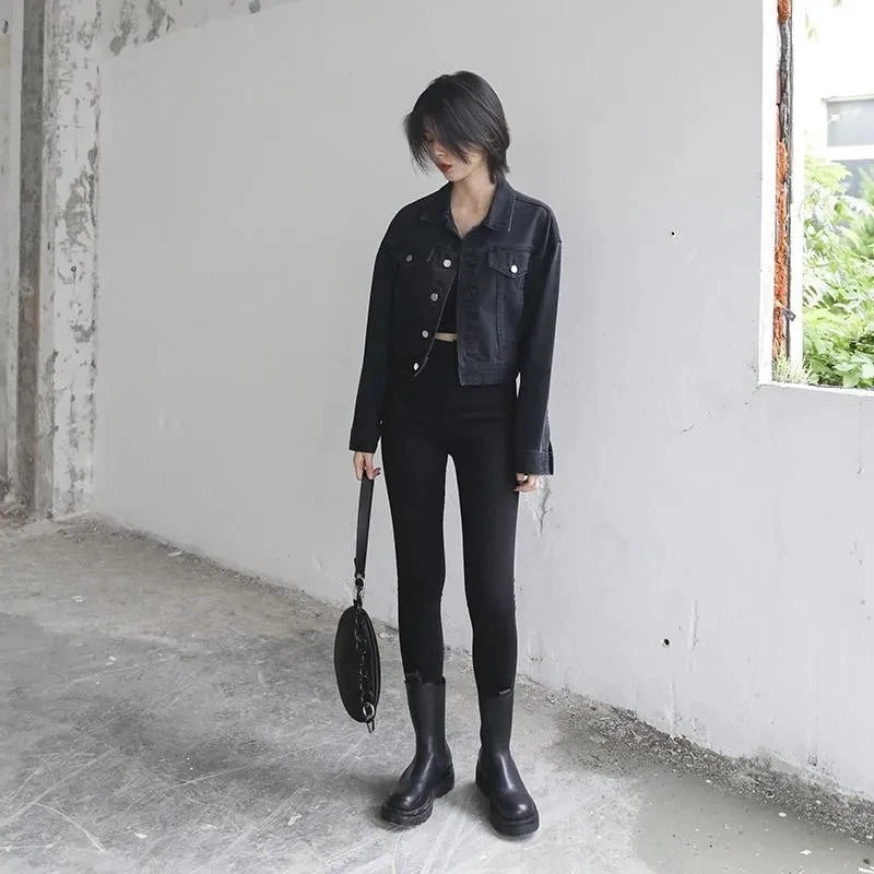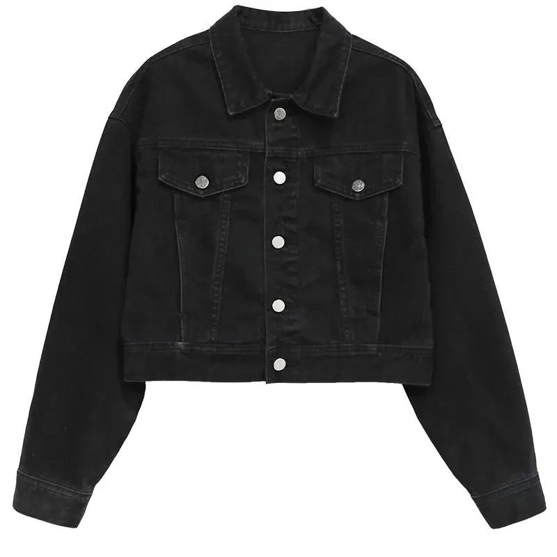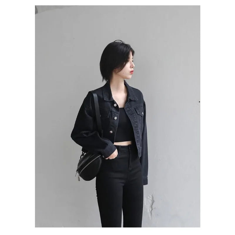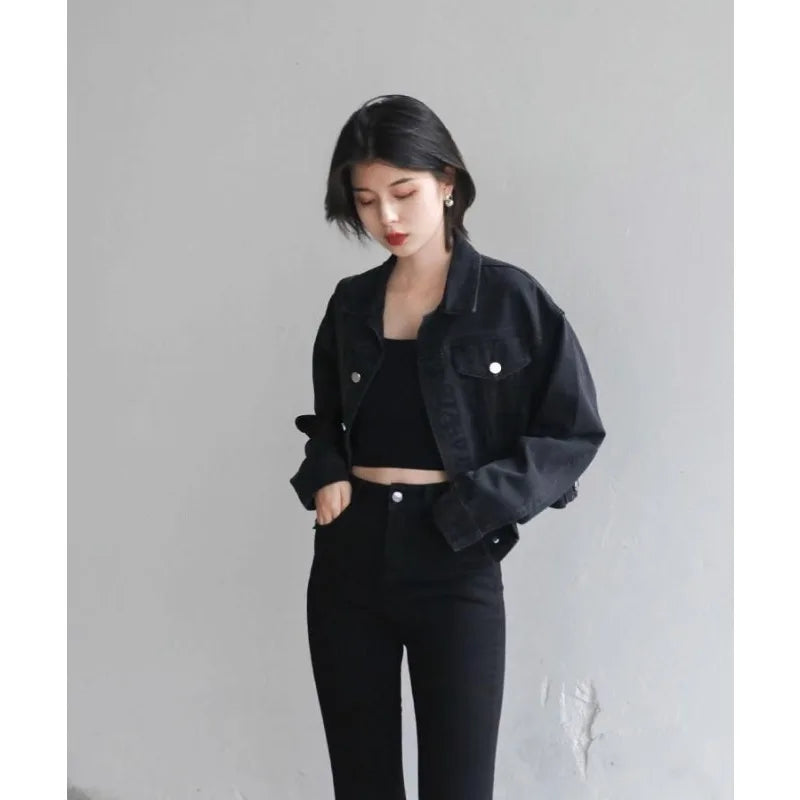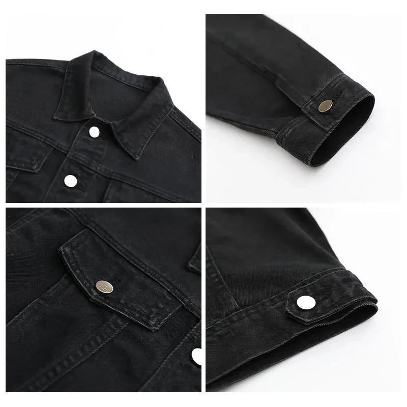 This jacket is a versatile outerwear piece, perfect for both spring and autumn seasons. Its classic black denim design makes it a versatile addition to any wardrobe.