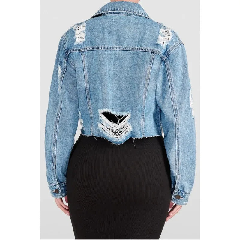 Women's Short Denim Jacket Distressed Frayed Hem Long Sleeve Collared Streetwear Fashion