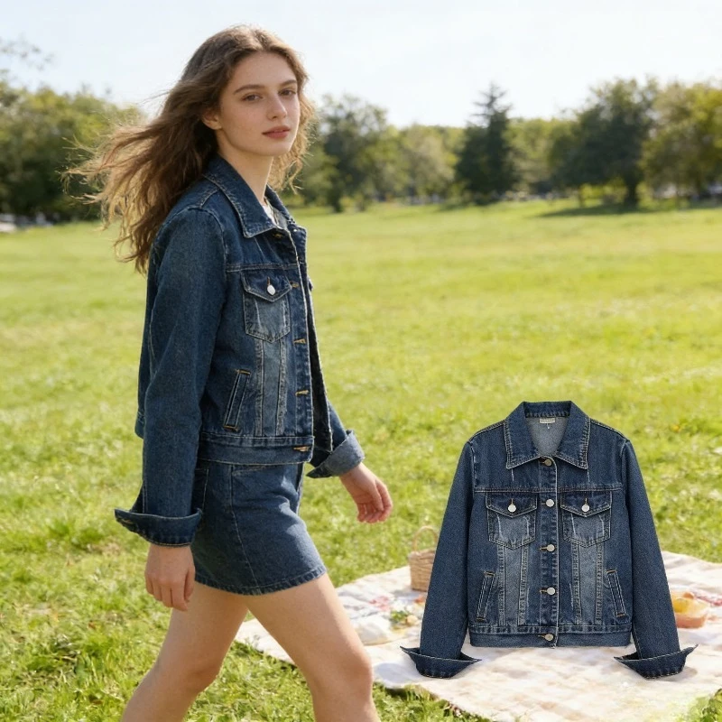 Womens Slim Fit Short Denim Jacket Washed Casual Long Sleeve Coat for Spring Autumn Daily Fashion